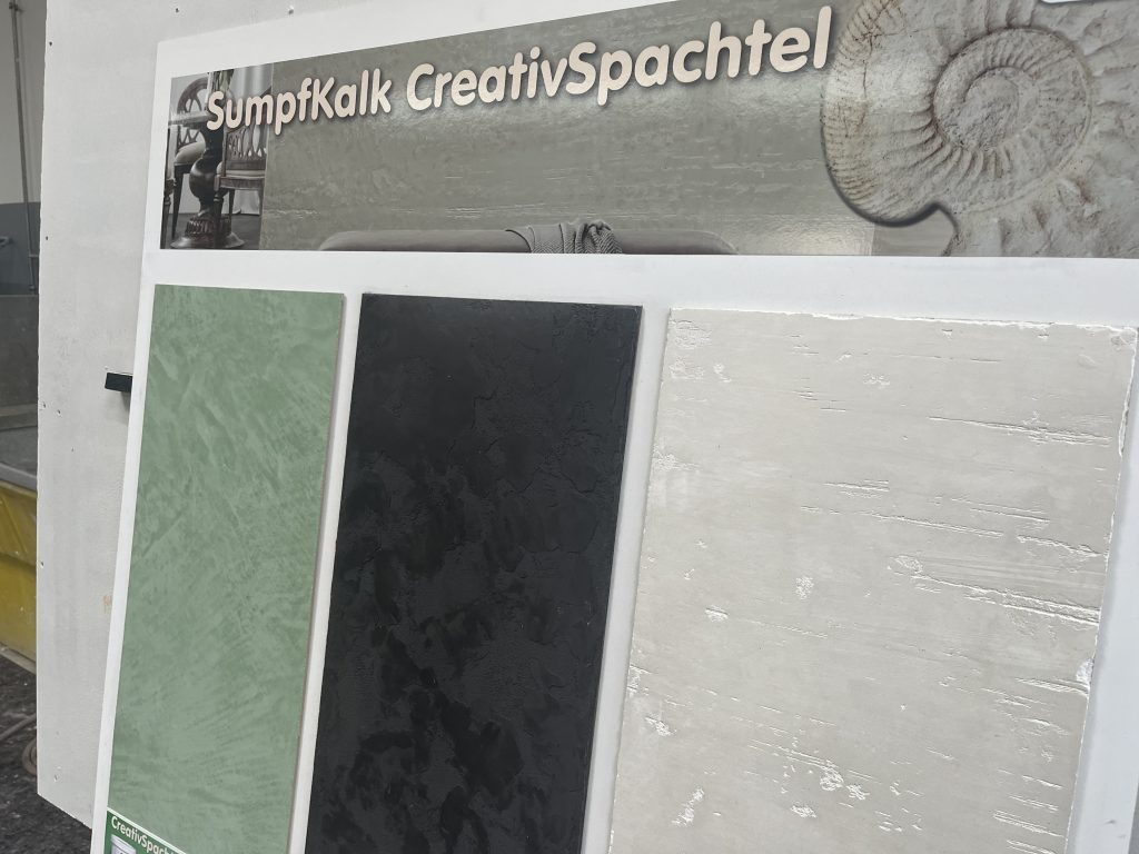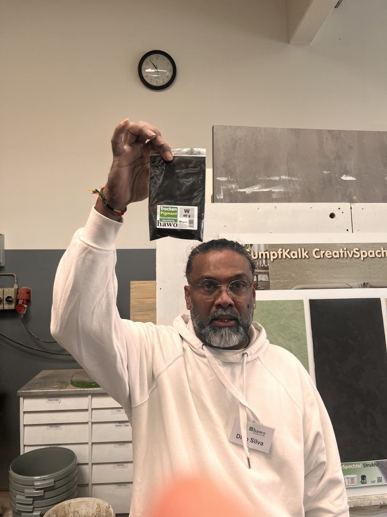 Dilip Silva zeigte u.a. hochwertige Creativ-Techniken wie edelmatte Glättetechnik, Besenstrichtechnik, Sahara Dünen, Kupfer-Metall-Optik.