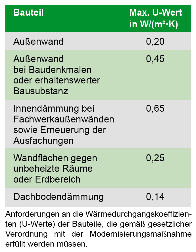 Die Anforderungen, die mit der energetischen Modernisierungsmaßnahme erfüllt werden müssen, sind in einer Verordnung (**) geregelt (siehe Tabelle rechts).