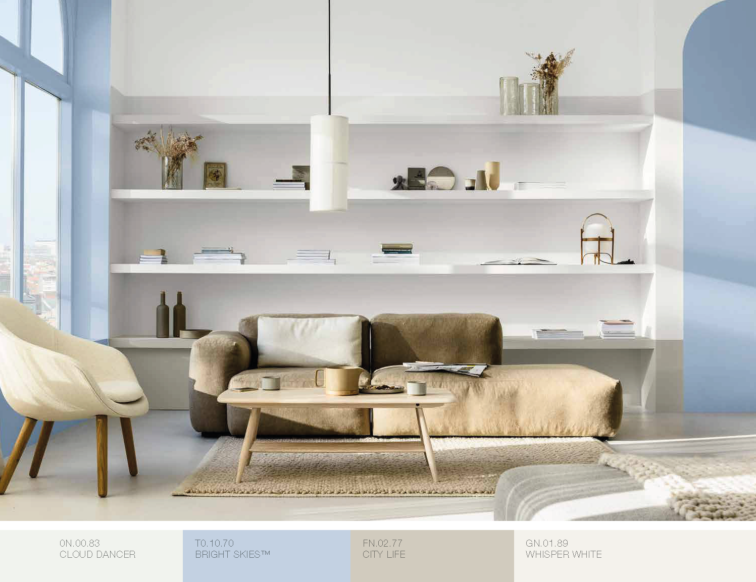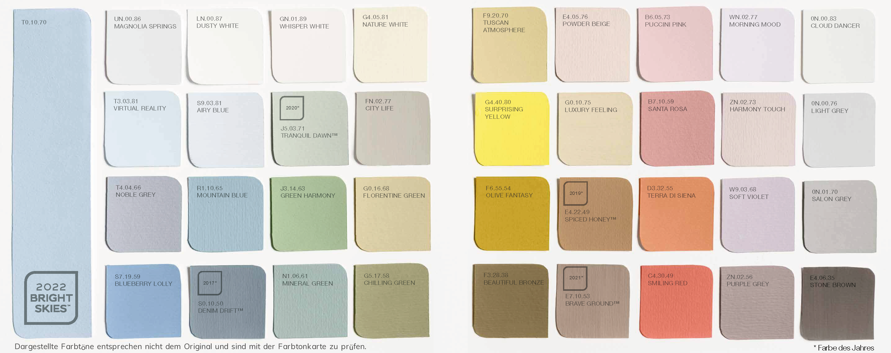 Die Farbe des Jahres 2022 Bright SkiesTM ist daher ein heller, luftiger und optimistischer Farbton, der wie eine frische Brise durch unser Zuhause weht und unsere Sehnsucht nach Freiheit und Entfaltung, nach freier Natur, frischer Luft und einem grenzenlosen Himmel erfüllt.