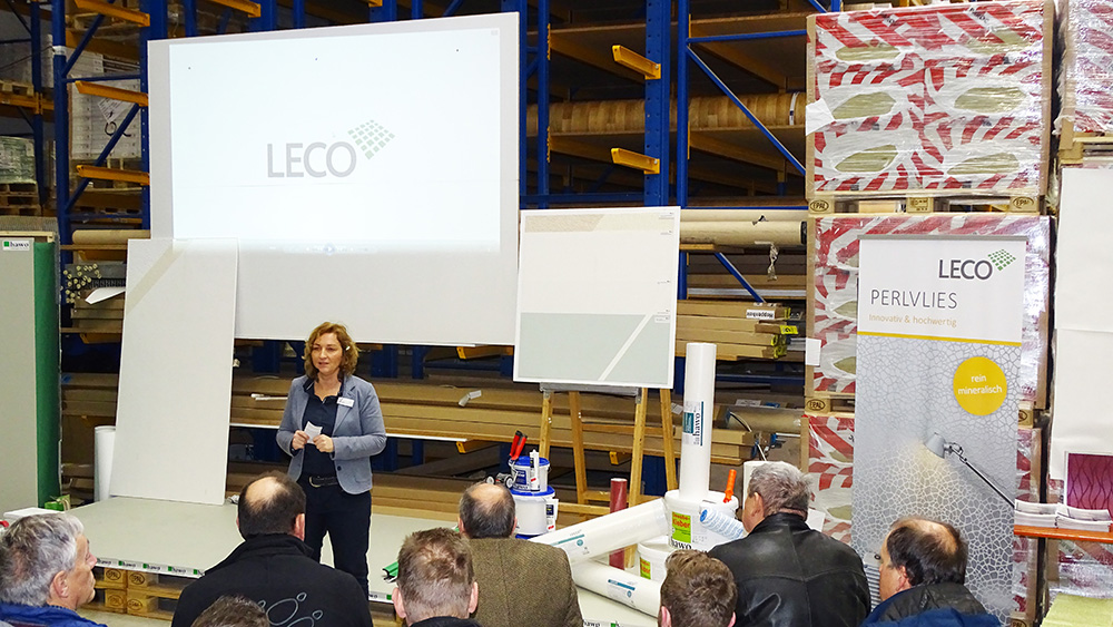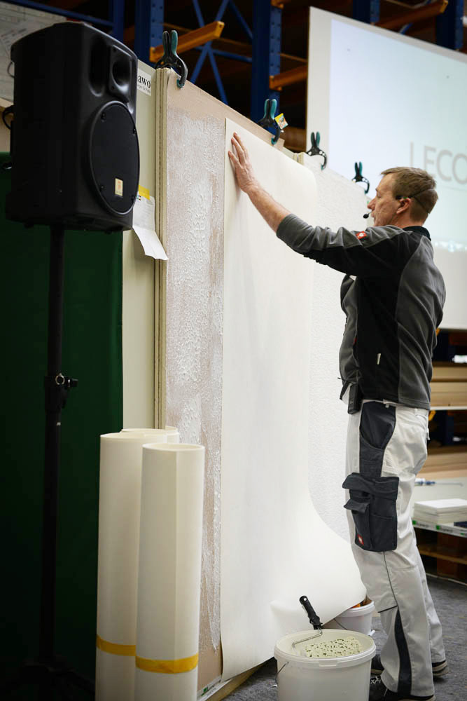 Staubfrei und schnell zur glatten Wand war Thema an Station 3. Sandra Jordan und Vorführmeister Detlef Gläser von hawo-Lieferant LECO-Werke Lechtreck GmbH & Co. KG informierten über das neue Spezialglasvlies Lecover. Durch einfaches Tapezieren können hiermit leichte bis mittlere Glasgewebestrukturen und Putze in einem Arbeitsgang abgedeckt und die Wand komplett geglättet werden. Somit entfallen aufwendiges Spachteln und Schleifen und ein zeiteffizienteres, staubfreies Arbeiten ohne Lärm mit einer Zeitersparnis von bis zu 75% wird erreicht.