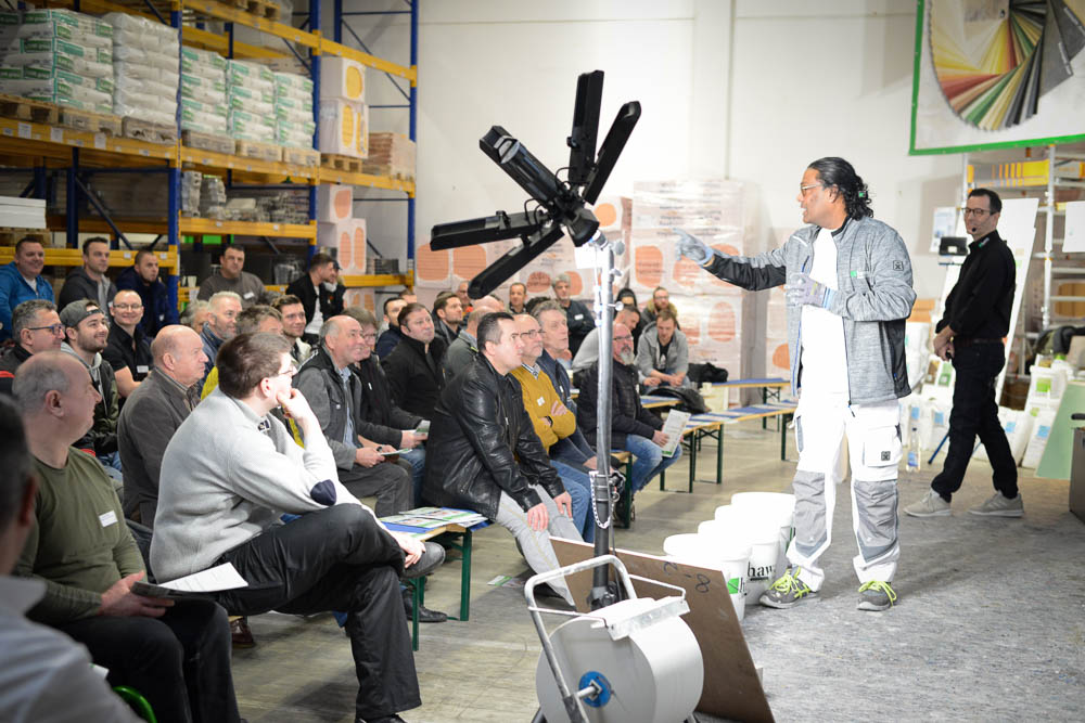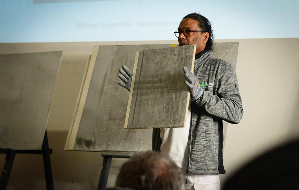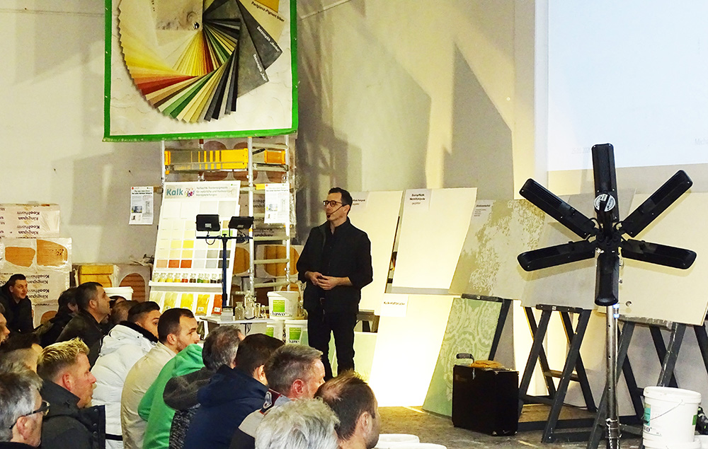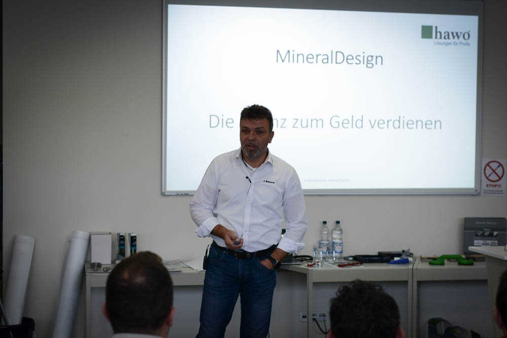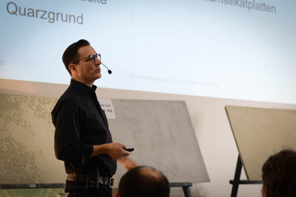 Jürgen Büssow zeigte die ökologische Alternative für Boden-, Wand- und Nassbereich - die MineralDesign Wand- und Bodenbeläge. Er gab den Zuhörern einen Überblick über die vielfältigen Dekore und Formate (XXXL-Format bis 1,20 m x 2,55 m) und detaillierte Hilfe für die Anwendung und Verarbeitung.