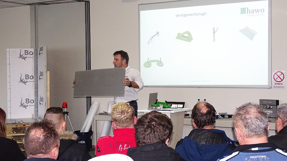 Ein weiterer Schwerpunkt seines praxisorientierten Vortrages war die Abdichtung von Innenräumen nach DIN 18534 und welche Vorschriften hier besonders zu beachten sind. Schritt für Schritt zeigte er anschließend die einzelnen Arbeitsschritte, welche Produkte hier zum Einsatz kommen und gab hilfreiche Tipps aus der Praxis für Abdichtungsarbeiten im Bad ohne Angst.