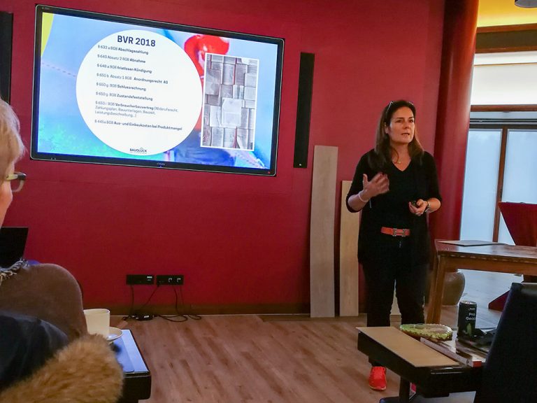 Fachanwältin für Bau- und Architektenrecht, Fernsehmoderatorin und Autorin Manuela Reibold-Rolinger erläuterte das Gesetz zur Reform des seit dem 1.1.2018 gültigen Bauvertragsrechts. Unter anderem soll das neue Gesetz für mehr Verbraucherschutz und Haftungsgerechtigkeit bei Bauvorhaben sorgen.