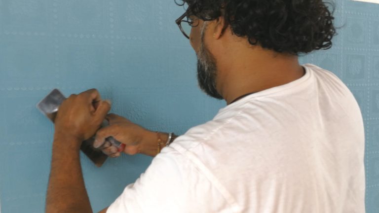 Die zweite der Wandschlablonen, hier die Jaeger Schablone „India“, auf den Untergrund auflegen und mit hawo Creativ Marmor Antikspachtel im Farbton hawo Farbtraum 3130 überziehen. Schablone sofort entfernen und leicht antrocknen lassen. |