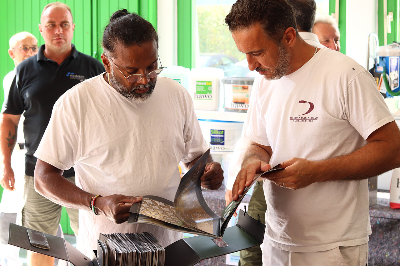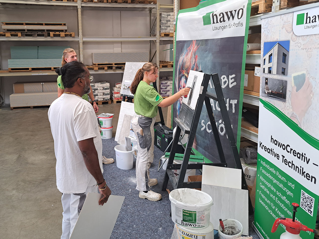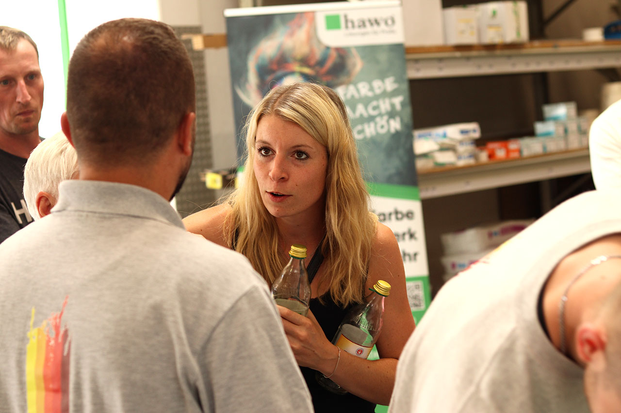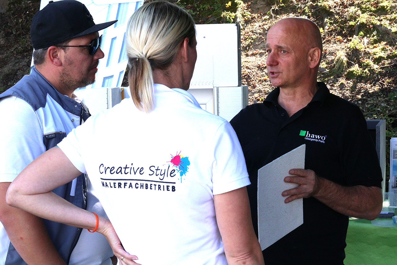Andreas Brehm zeigte Anschlusslösungen im Bereich WDV-Systemen vor und Michael Knapheide zeigte die breite hawo-Palette von Spachtelmassen, insbesondere die neue hawo Fill & Finish light-Spachtelmasse. Die Firma Impra präsentierte hochwertige Produkte für Holzbeschichtungen, die bei unseren Besuchern auf großes Interesse stießen.