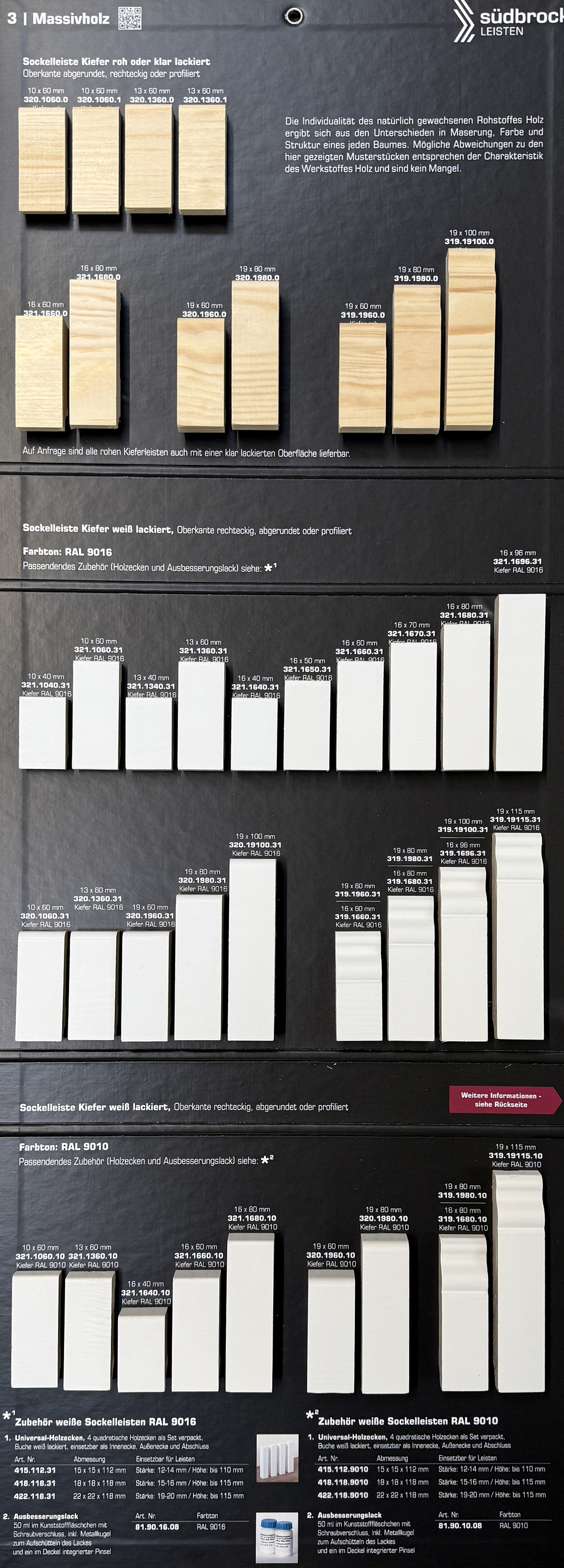 Typische Profile: Sockelleisten, Abschlussleisten, Kantenleisten, Rundprofile, Zierleisten