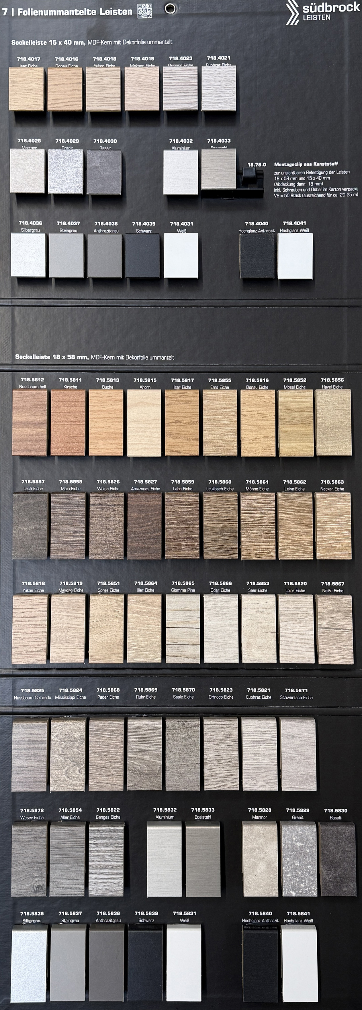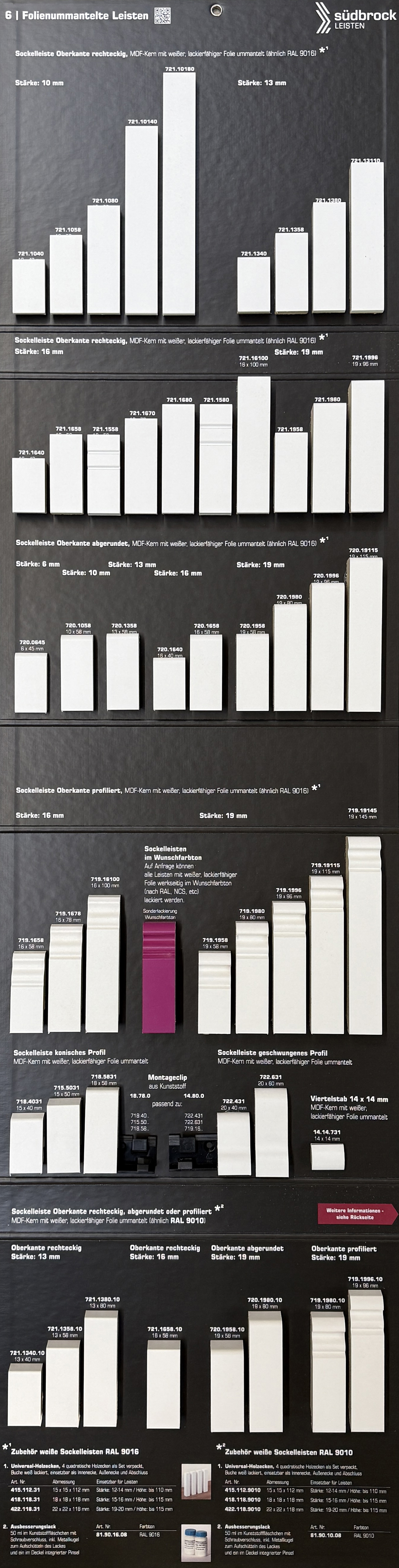 Südbrock-Leisten setzen präzise Akzente und verleihen jedem Raum ein harmonisches, hochwertiges Gesamtbild. Ob moderne MDF‑Profile oder edles Massivholz – für fachgerechte Verarbeitung, Beständigkeit und Stil.